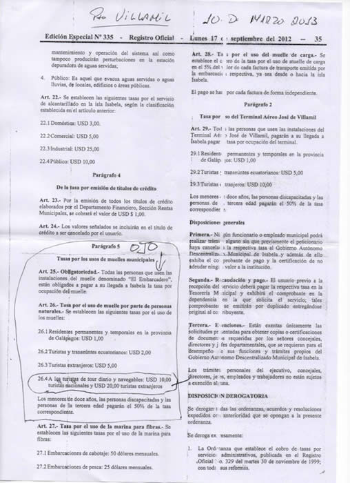Article 26.4 .- " All tourist arriving on day trip yachts and live aboard cruises 10 US dollars for ecuadorians 20US dollars for foreigners"