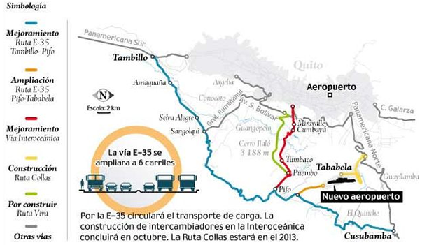 Ruta Collas-New Airport From Km 7 1/2 of the Panamerican Highway, north, this route will reach Tababela through a bridge which will be built over the Guayllabamba River. The municipality is considering to build a temporary bridge that would allow the use of the road at the end of 2013.